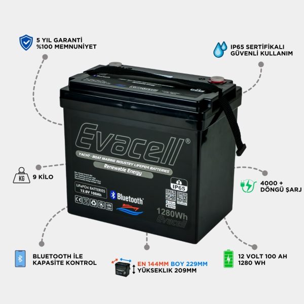 Evacell 12.8v (12 Volt) 100 Ah Amper LiFePO4 Lityum Demir Fosfat Akü / Batarya